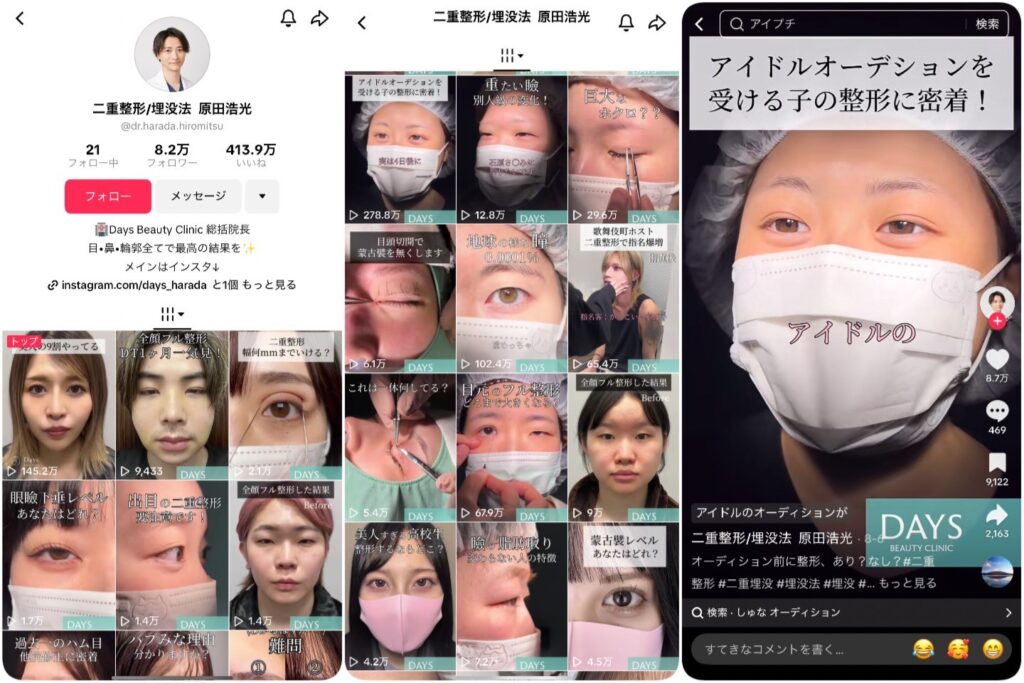 SNS、特にTikTokでは、手術の様子を強調するのではなく、術後の患者様の喜びの声や変化を紹介しています。