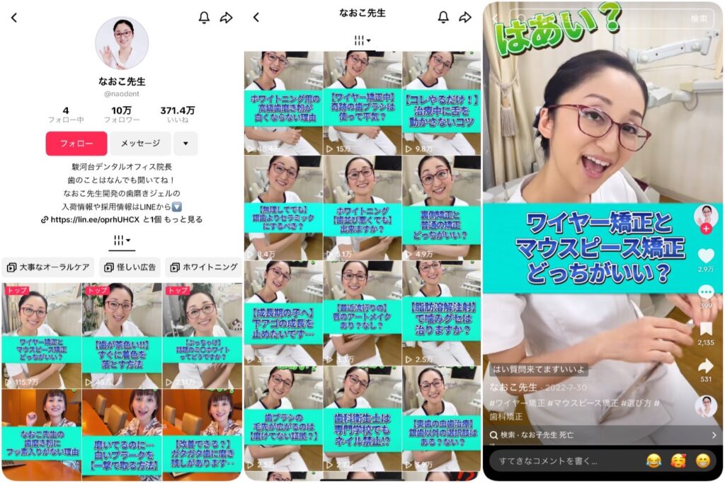 また、このアカウントのように、歯科医師やスタッフが自然体で登場し、患者の生活に寄り添うコンテンツを発信することは、SNSでの信頼感を築く大きな要素となります。