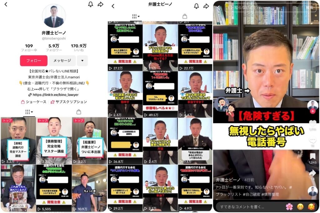 TikTokにおいて、専門性の高い法律分野でフォロワー数を伸ばした成功事例が「弁護士ビーノ」様のアカウントです。